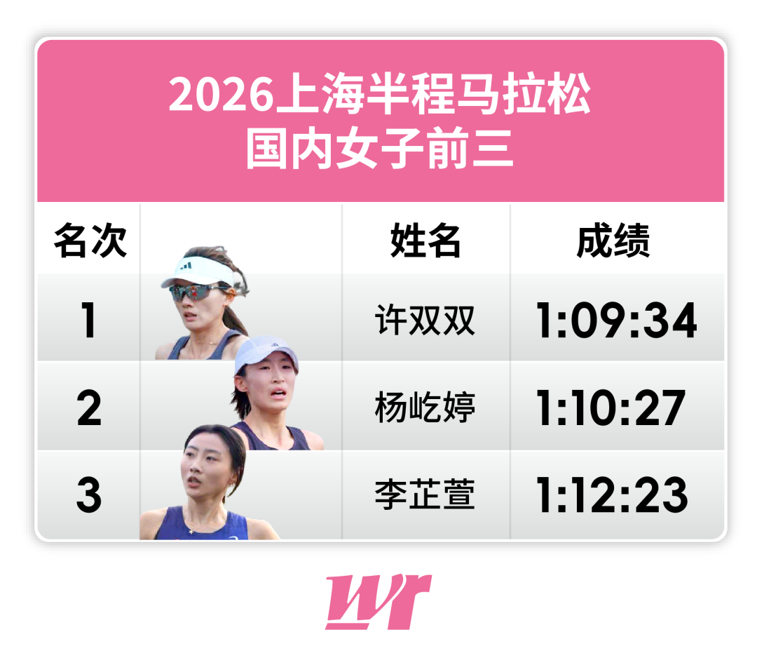 半小时后,上海半程马拉松于7点发枪。作为上马系列赛的重磅赛事,今年上半马首次将举办时间从往年四月中下旬提至3月中。国内女方面,转战路跑的许双双势头强劲,将领先优势一路保持到终点,以1小时09分34秒斩获国际第三,卫冕国内冠军,并将半马PB提升了43秒;宁夏队的杨屹婷以1小时10分27秒刷新去年环东跑出的1小时13分15秒的首半马PB,拿下国内第二;李芷萱以1小时12分23秒拿下国内第三。男子方面,马瑞以1小时02分49秒拿下国内冠军,桑吉东知和唐浩然分居第二、三名。